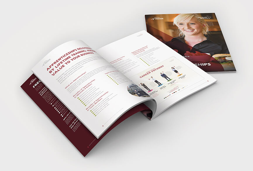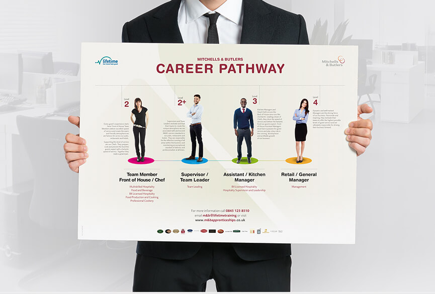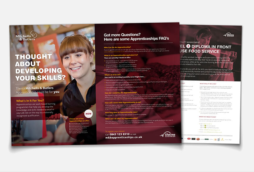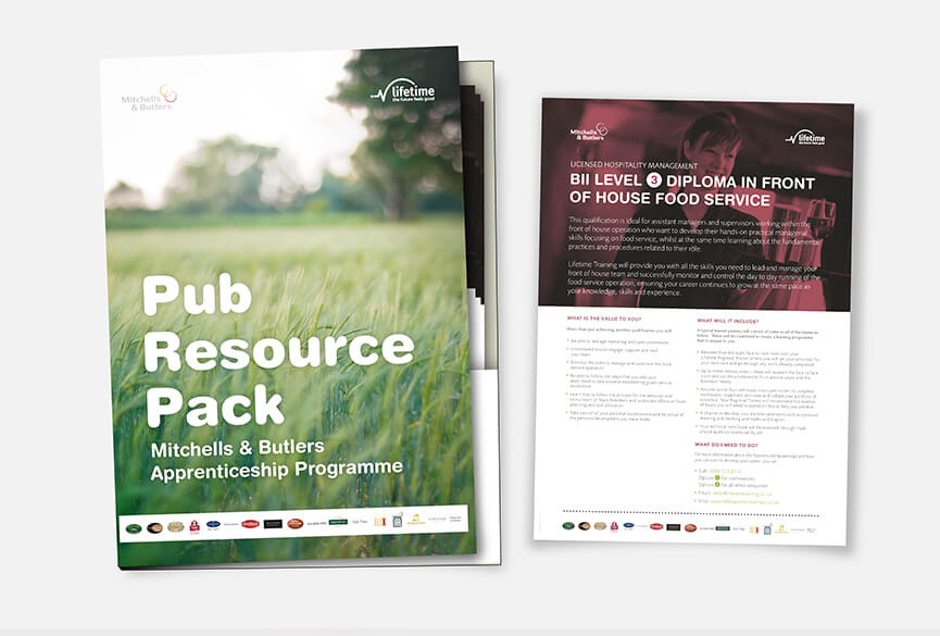 A wide range of branded material was presented to the client to help visualise how Lifetime Training can provide apprenticeships for Mitchells & Butler. The pitch successfully landed a multi-million pound contract and become Lifetime Training secod biggest client.